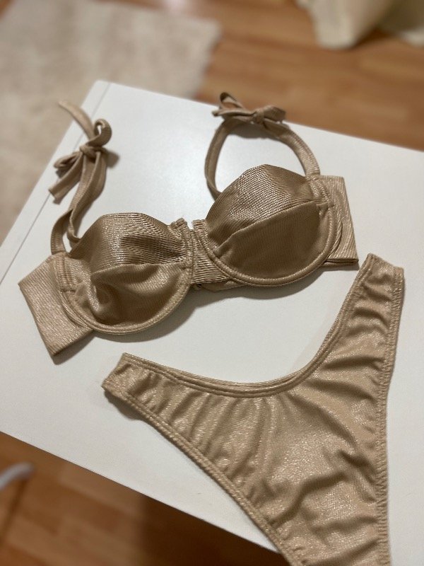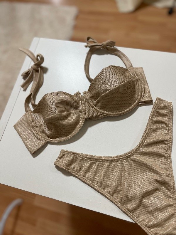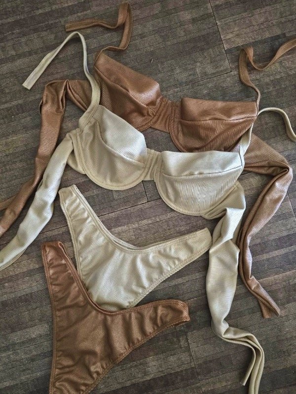 Bikini aro con breteles de moño y less en V. Brillosa de morley. Este modelo es el color mas claro de la imagen!