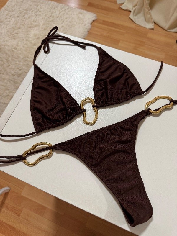 Bikini con avios dorados, sin relleno desmontable, se puede hacer moño.