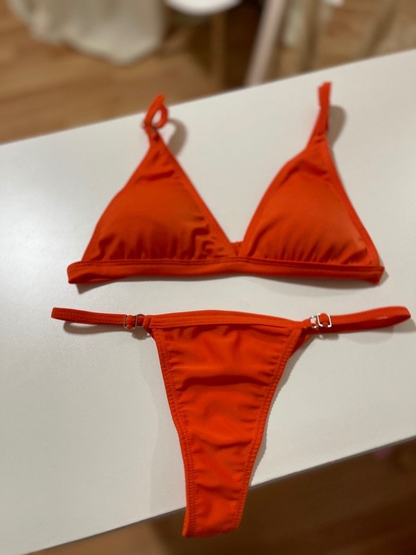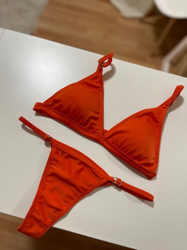 Bikini con less regulable y relleno desmontable, broche en la espalda y breteles regulable.