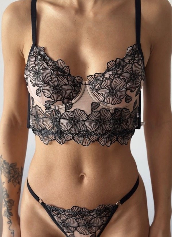 Conjunto bordado en tul con encaje y aro, mas regulable y se puede ajustar la espalda