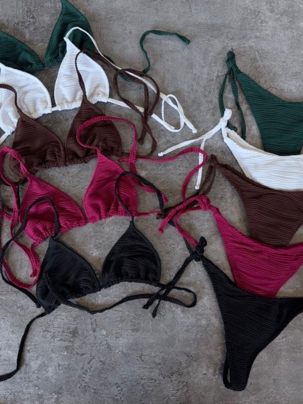 Bikini texturada con less de tiras. Puede agregarse relleno desmontable