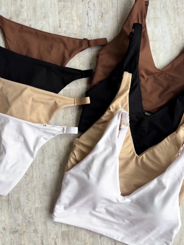 Conjunto con corpiño top con corte en V mas less ancha. Mas relleno desmontable
